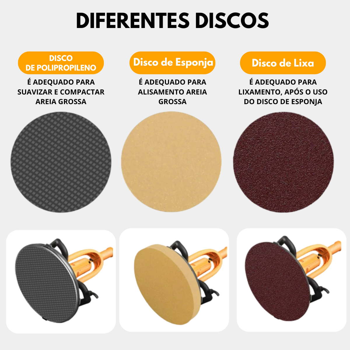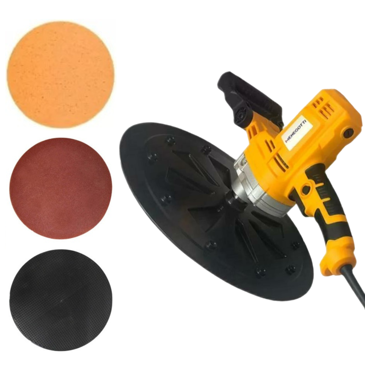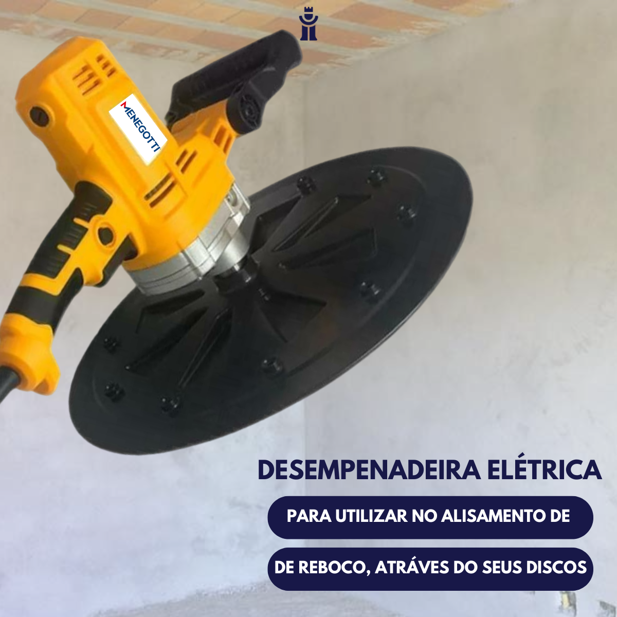Equipamento projetado para alisamento de reboco, através de seus discos de polipropileno, esponja e lixa para desempenar, camurça e lixar as paredes e tetos.